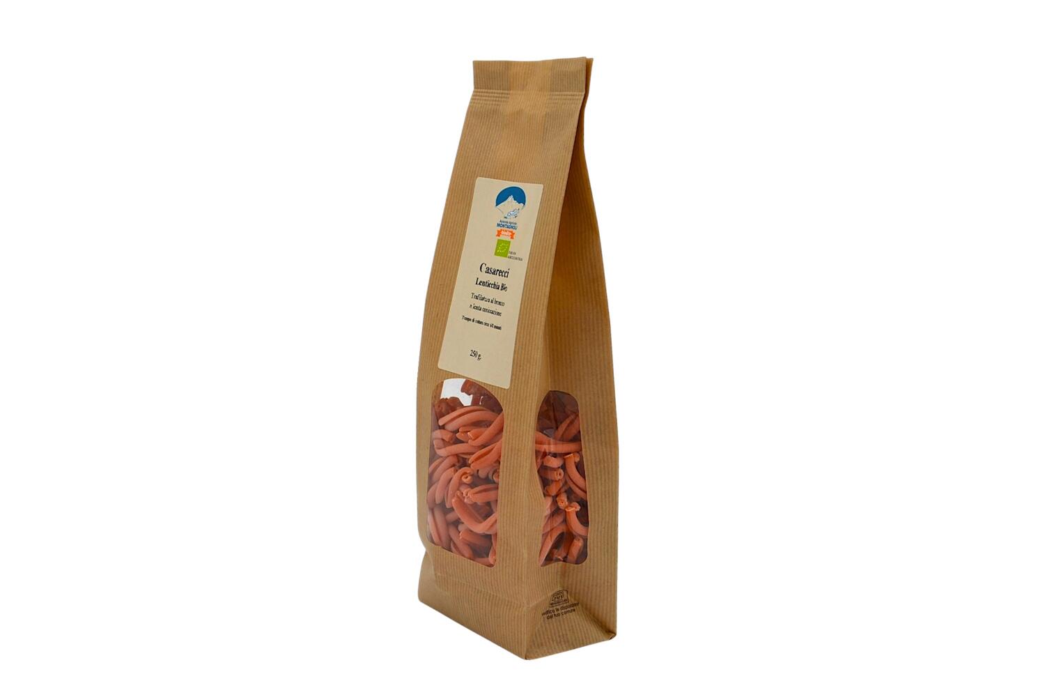 I Caserecci di Lenticchie BIO di Montagnoli sono trafilate al bronzo, costituiti esclusivamente da farina di legumi BIO macinata a pietra e acqua sorgiva: le materie prime sono 100% italiane BIO, da agricolture sostenibili in filiera tracciata e gluten free.